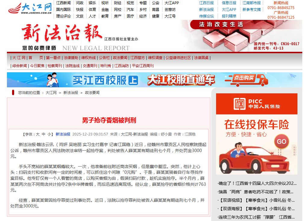 《新法治报》政法栏目刊登肖妍、吴艳丽《男子抢夺香烟被判刑》