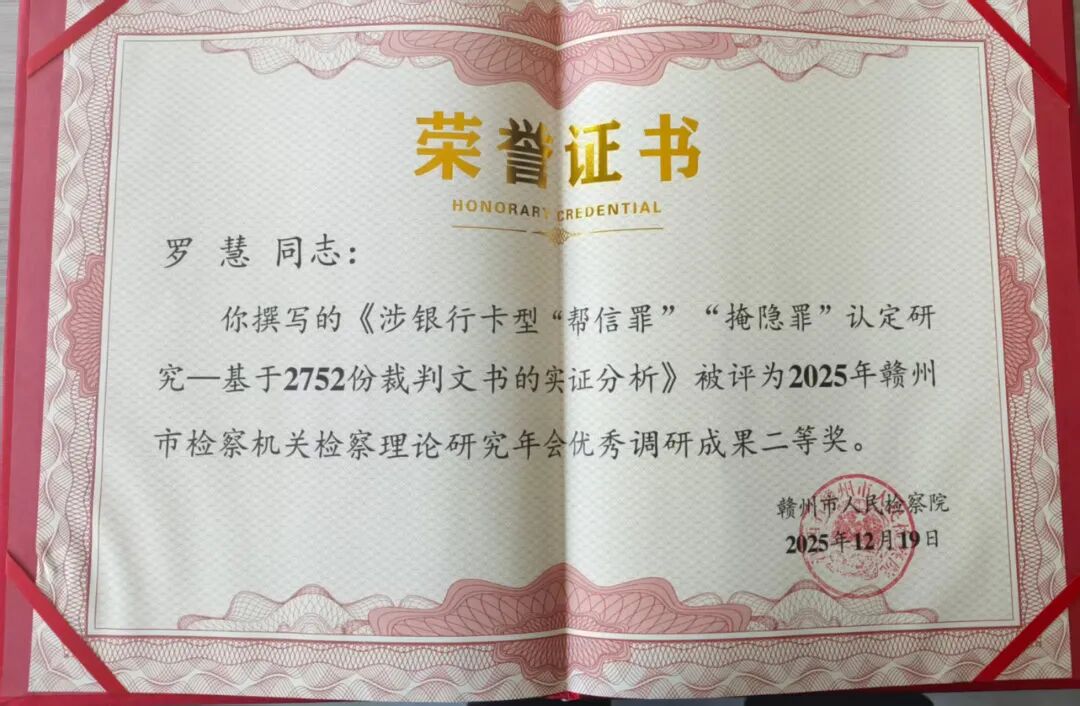 12月26日,在2025年赣州市检察理论研究年会上,我院一篇论文获“二等奖”、一篇论文获“三等奖”,同时获“优秀组织单位”。